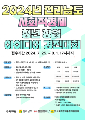Àü³²»çȸÀû°æÁ¦ÅëÇÕÁö¿ø¼¾ÅͰ¡ ÀáÀç·Â ÀÖ´Â ¼Ò¼È â¾÷ ¾ÆÀÌÅÛ ¹ß±¼À» À§ÇØ ¡®Àü¶ó³²µµ »çȸÀû°æÁ¦ û³â â¾÷ ¾ÆÀ̵ð¾î °æÁø´ëȸ¡¯ Âü°¡ÀÚ¸¦ ¸ðÁýÇÑ´Ù. °æÁø´ëȸ´Â Àü¶ó³²µµ, ÇÑÀüKDNÀÌ ÁÖÃÖÇϰí Àü³²»çȸÀû°æÁ¦ÅëÇÕÁö¿ø¼¾ÅÍ(»ç´Ü¹ýÀÎ »ó»ý³ª¹« ¿î¿µ)°¡ ÁÖ°üÇØ ÃßÁøµÈ´Ù.