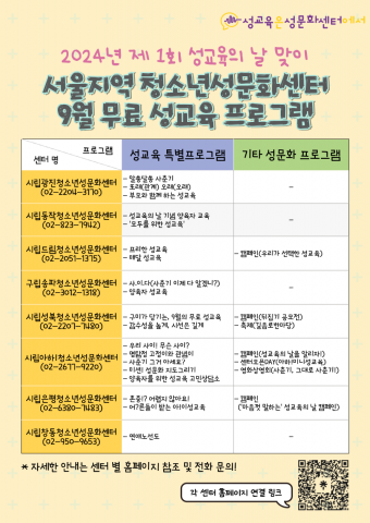 ¼¿ïÁö¿ªÃ»¼Ò³â¼º¹®È¼¾ÅÍ´Â ¼º±³À°ÀÇ ³¯À» ¸Â¾Æ ´Ù¾çÇÑ ¼º±³À° Ưº° ÇÁ·Î±×·¥ ¹× ¼º¹®È ÇÁ·Î±×·¥(Ä·ÆäÀÎ, ÃàÁ¦ µî)À» ¹«·á·Î ÁøÇàÇÒ ¿¹Á¤À̸ç, ÀÚ¼¼ÇÑ ÀÏÁ¤Àº °¢ ¼¾ÅÍ È¨ÆäÀÌÁö¿¡¼ È®ÀÎ °¡´ÉÇÏ´Ù.